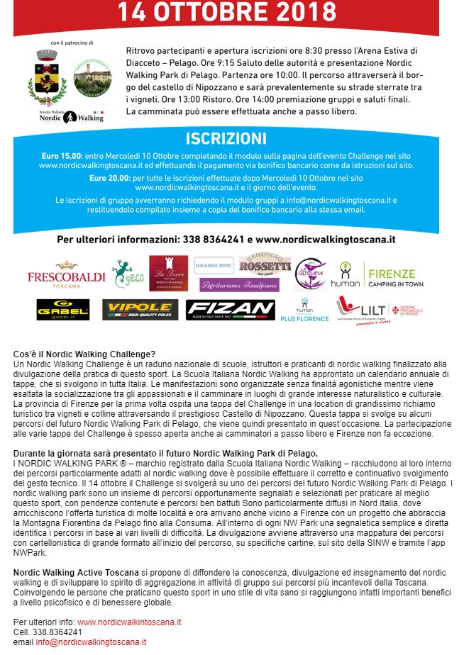 NORDIC WALKING TOSCANA ed ASSOCIAZIONE ITALIANA PARKINSONIANI SEZIONE DI FIRENZE di nuovo insieme in occasione del Challenge 2018 Firenze su di un percorso ridotto guidati da un istruttore SINW .