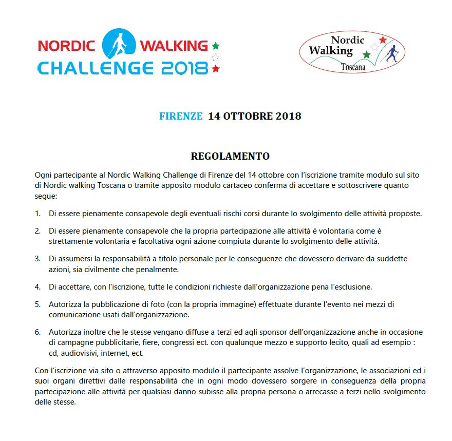 Qui di seguito viene riportato il regolamento del Nordic Walking Challenge di Firenze che ogni partecipante deve sottoscrivere inviando il modulo via web o compilando il modulo cartaceo.