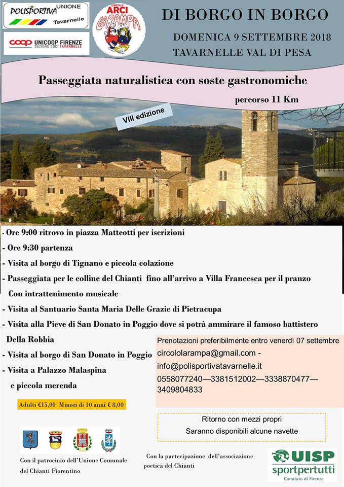 Il nostro gruppo ha partecipato alla manifestazione patrocinata dal Comune di Tavarnelle V.P. Di Borgo in Borgo: una camminata nordic walking e passo libero tra i borghi più belli da Tavarnelle a San Donato in Poggio con soste culturali e gastronomiche. Quale miglior modo di unire l’attività culturale e gastronomica (colazione-pranzo e merenda) alla compagnia di un gruppo affiatato? Vi aspettiamo alle nostre prossime uscite !