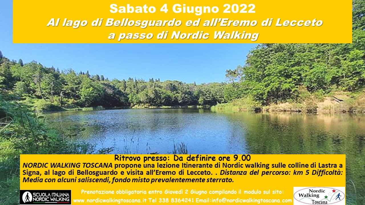 Sabato 4 giugno andiamo al lago di Bellosguardo e all’eremo di Lecceto a passo di nordic walking sulle colline di Lastra a Signa. Percorso di circa 5 km con alcuni saliscendi su fondo prevalentemente sterrato. Per iscriversi compilare il modulo sottostante entro giovedì 2 giugno