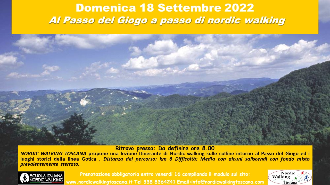Domenica 18 settembre andiamo a passo di nordic walking al Passo del Giogo e i luoghi storici della linea gotica nel Mugello su un percorso prevalentemente sterrato di circa 8 km . Per iscriversi compilare il modulo sottostante entro sabato 17 settembre.