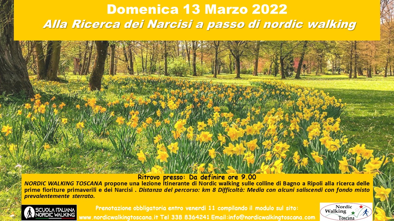 Domenica 13 marzo lezione itinerante sulle colline di Bagno a Ripoli alla ricerca dei narcisi in fiore. Percorso di circa 8 km con diversi saliscendi su fondo prevalentemente sterrato. Per partecipare é obbligatorio iscriversi compilando il modulo sottostante entro venerdì 11 marzo scrivendo NARCISI DI BAGNO A RIPOLI