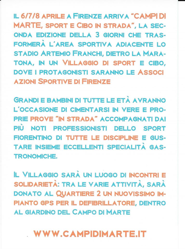 Nordic Walking Active Toscana sarà presente alla 2° edizione della manifestazione Campi di Marte che si terrà dalle 17 di venerdì 6 aprile alle 20 di domenica 8 aprile. Sarà possibile fare prove di nordic walking, avere consigli di allenamento personalizzati e fare lezioni itineranti di prova nei dintorni. Il tutto nell’area Maratona accanto lo Stadio Artemio Franchi