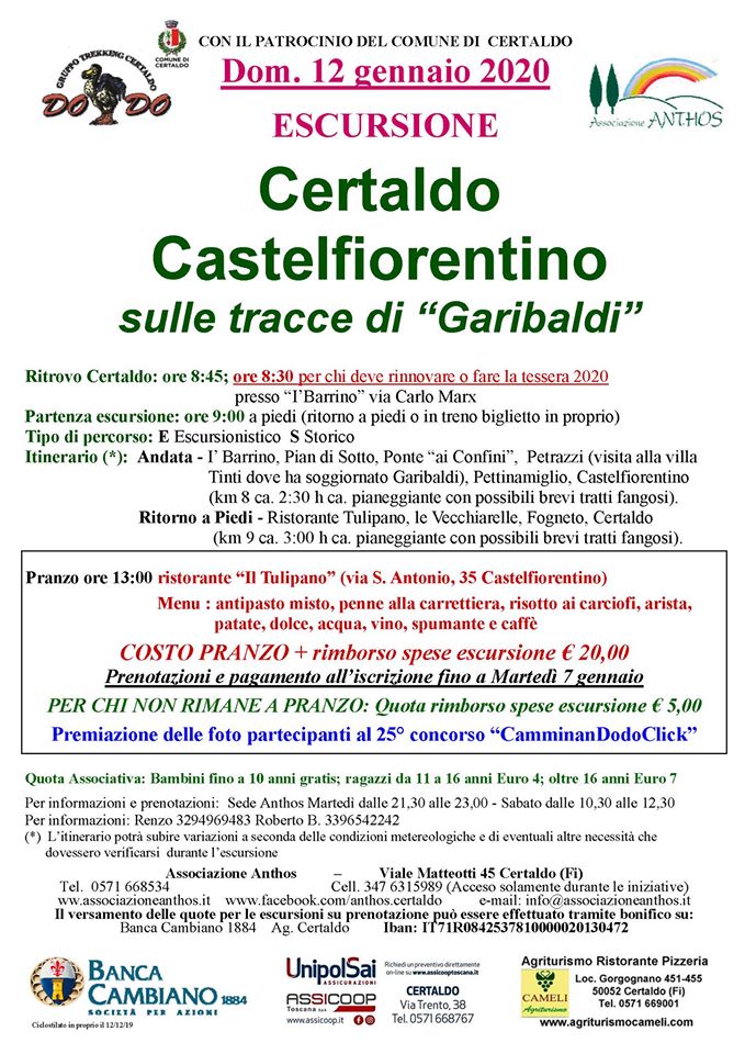 Domenica 12 gennaio partecipiamo alla escursione organizzata dall’Associazione Anthos di Certaldo. Per partecipare é necessario prenotare entro martedì 7 gennaio e iscriversi all’Associazione Anthos- quota di iscrizione € 7. Chi volesse aderire con il nostro gruppo praticando il nordic walking é pregato di compilare il modulo di iscrizione sottostante specificando se desidera restare a pranzo (CERTALDO CASTELFIORENTINO + PRANZO oppure CERTALDO CASTELFIORENTINO – PRANZO).