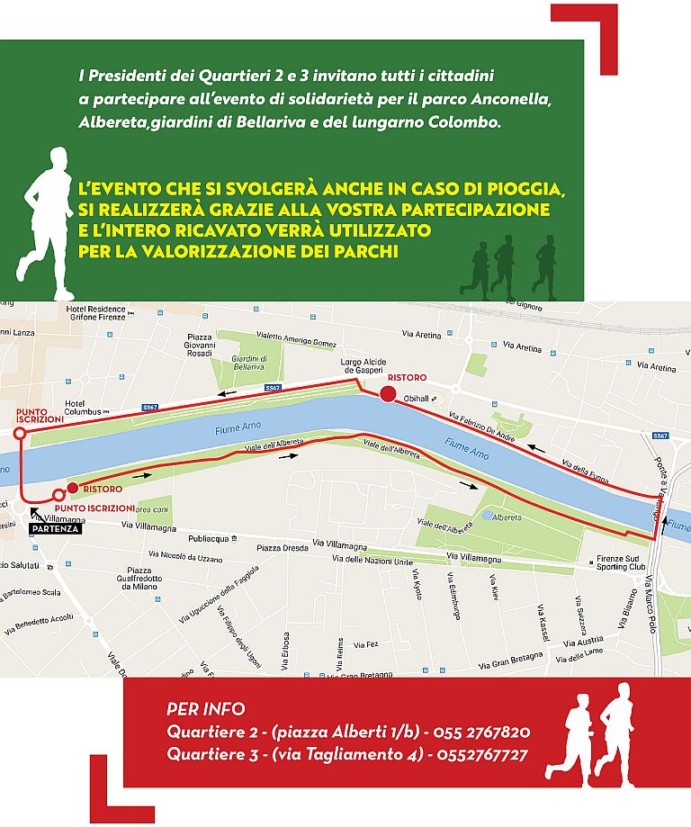 Ritorna la tradizionale manifestazione podistica in favore dei parchi del Quartiere 2 e 3 di Firenze. Il ricavato della manifestazione verrà impiegato per i parchi sul lungarno dei due quartieri. Quest’anno anche a passo di nordic walking! Possibilità di prenotare i biglietti compilando il modulo sottostante . Il biglietto sarà consegnato alla partenza dando il nome.