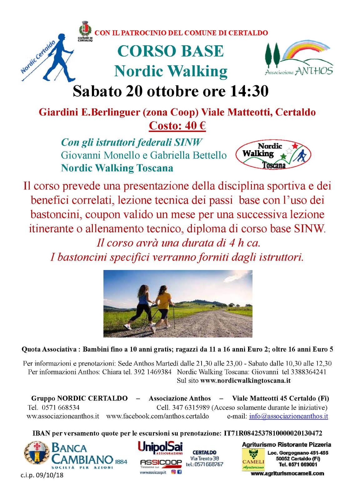 Corso base di nordic walking riservato ai soci Anthos (possibilità di iscriversi in loco a 5 euro) Apprendere uno sport outdoor completo adatto a tutti a Certaldo, nei giardini Berlinguer, davanti alla Coop. Il costo del corso comprende una sessione intensiva il pomeriggio del sabato, un coupon per una lezione tecnica nel corso del mese successivo e noleggio bastoncini specifici.