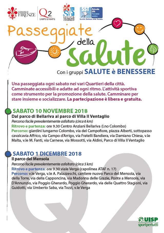 Sabato 10 novembre riprendono le passeggiate Salute è Benessere nel Quartiere 2 con una camminata che parte dai rinnovati Giardini di Bellariva, dove si sono effettuati importanti lavori di riqualificazione dopo il devastante evento atmosferico di qualche anno fa, che ne aveva distrutto quasi tutta la vegetazione arborea per arrivare ad ammirare il Parco di Villa il Ventaglio, anch’esso recentemente riaperto per intero fino a comprendere la zona arborea sul versante della collina. La Partenza è prevista alle ore 9 dal Centro Anziani di Bellariva