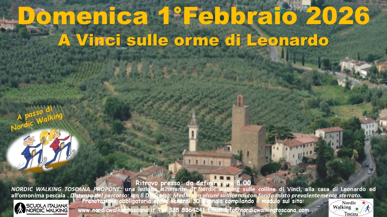 NORDIC WALKING TOSCANA propone Domenica 1° Febbraio 2026 una Lezione Itinerante sulle colline di Vinci, lungo le orme di Leonardo alla casa natale ed alla pescaia omonima a passo di Nordic walking. Percorso 8 Km.  Difficoltà: Media con alcuni saliscendi, fondo misto asfalto e sterrato. Prenotazione obbligatoria entro Venerdì 30 Gennaio compilando il modulo sottostante. Indicando nel campo Evento scelto ” Vinci – Leonardo ”