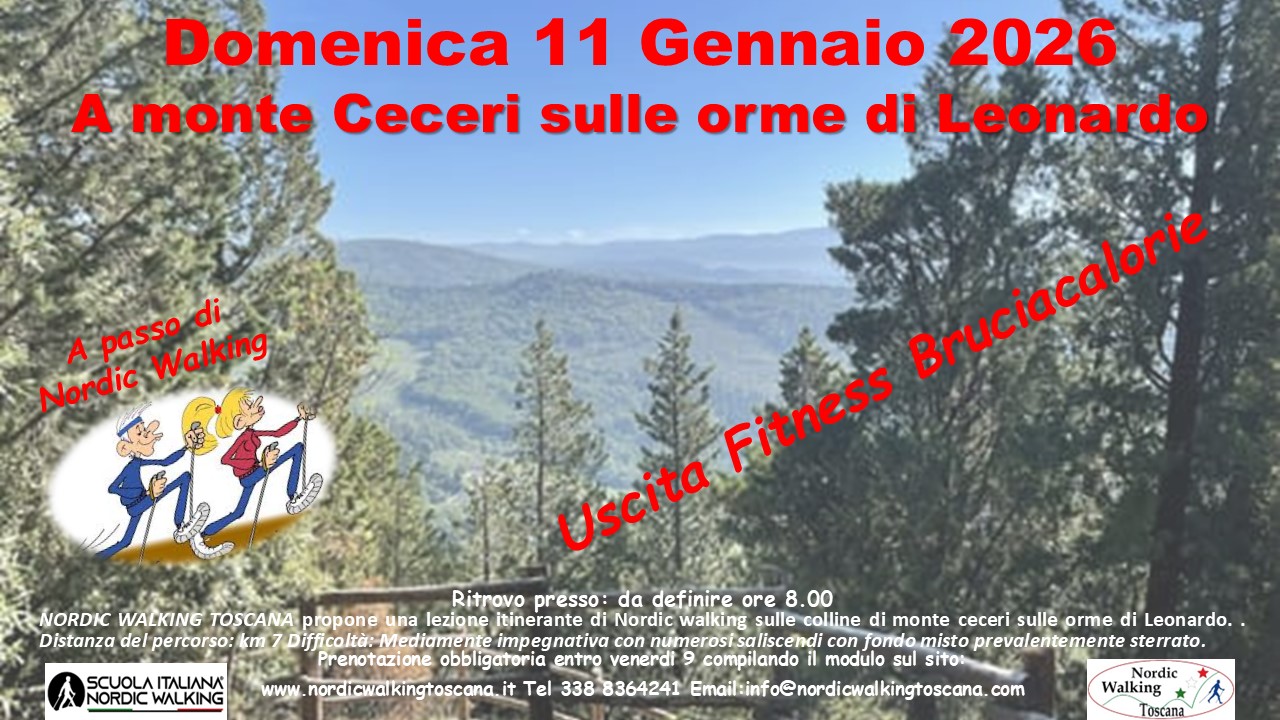 NORDIC WALKING TOSCANA propone Domenica 11 Gennaio 2026 una Lezione Itinerante sulle colline di Monte Ceceri sulle orme di Leonardo a passo di Nordic walking. Uscita Fitness adatta a chi ha un minimo di allenamento e resistenza in salita. Percorso 7 Km.  Difficoltà: Medio impegnativa con numerosi saliscendi, fondo misto prevalentemente sterrato. Prenotazione obbligatoria entro Venerdì 11 compilando il modulo sottostante. Indicando nel campo Evento scelto ” Monte Ceceri ”