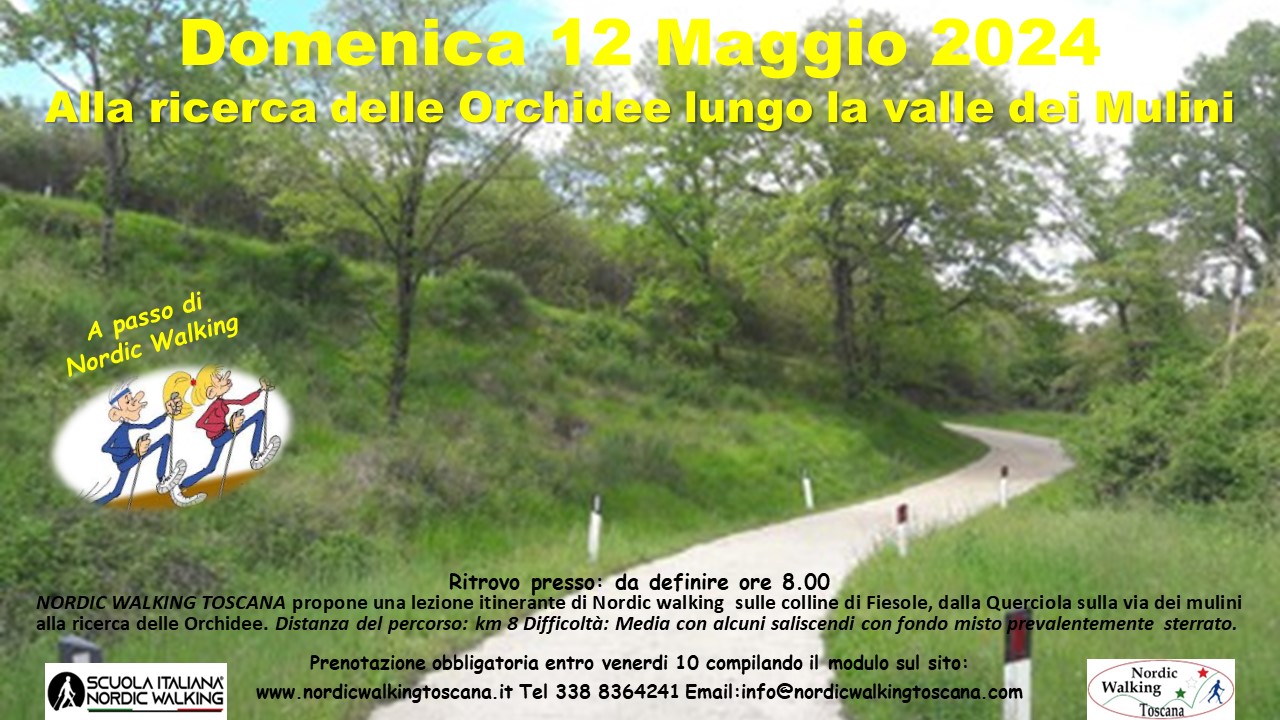 NORDIC WALKING TOSCANA propone Domenica 12 Maggio una lezione Itinerante sulle colline di Fiesole, lungo la via dei Mulini, incrociando la storica via di Stilicone in cerca delle ultime Orchidee. Distanza del percorso: km 8 Difficoltà: Media con alcuni saliscendi fondo misto prevalentemente sterrato. Prenotazione obbligatoria entro Venerdì 10 compilando il modulo sottostante in dicando nel campo Titolo evento ” la via dei Mulini”.