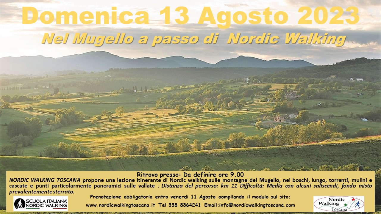 NORDIC WALKING TOSCANA propone Domenica 13 Agosto 2023 una lezione Itinerante nel Mugello. Nei boschi tra acque, mulini e lungo crinali particolarmente panoramici sulle valli a passo di Nordic walking e promozionalmente aperta anche ai camminatori a passo libero. Distanza del percorso: km 11 Difficoltà: Media con alcuni saliscendi fondo misto prevalentemente Sterrato. Prenotazione obbligatoria entro Venerdì 11 compilando il modulo sottostante.