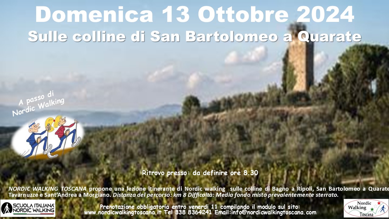 NORDIC WALKING TOSCANA propone Domenica 13 Ottobre 2024 una Lezione Itinerante sulle colline di Bagno a Ripoli, San Bartolomeo a Quarate, la torre ed il Castello, i borghi di Tavarnuzze e Sant’Andrea a Morgiano. , a passo di Nordic walking. Distanza del percorso: km 8 Difficoltà: Media con alcuni saliscendi, fondo misto prevalentemente Sterrato. Prenotazione obbligatoria entro Venerdì 11 compilando il modulo sottostante. Indicando nel campo Evento scelto ” Quarate ”