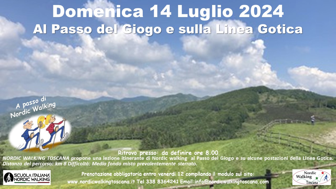 NORDIC WALKING TOSCANA propone Domenica 14 Luglio 2024 una lezione Itinerante al Passo del Giogo e sulle Postazioni della linea Gotica a passo di Nordic walking. Distanza del percorso: km 8 Difficoltà: Media con alcuni saliscendi fondo misto prevalentemente Sterrato. Prenotazione obbligatoria entro Venerdì 12 compilando il modulo sottostante indicando nel campo evento scelto ” Passo del Giogo ”