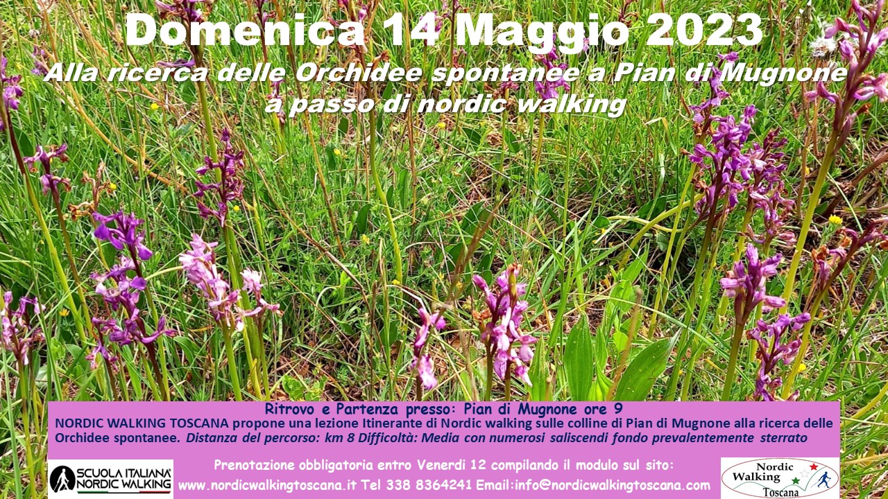NORDIC WALKING TOSCANA propone Domenica 14 Maggio 2023 una lezione Itinerante alla ricerca delle Orchidee spontanee della valle del Mugnone a passo di Nordic walking. Distanza del percorso: km 8 Difficoltà: Media con alcuni saliscendi fondo misto prevalentemente Sterrato. Prenotazione obbligatoria entro Venerdì 12 compilando il modulo sottostante.