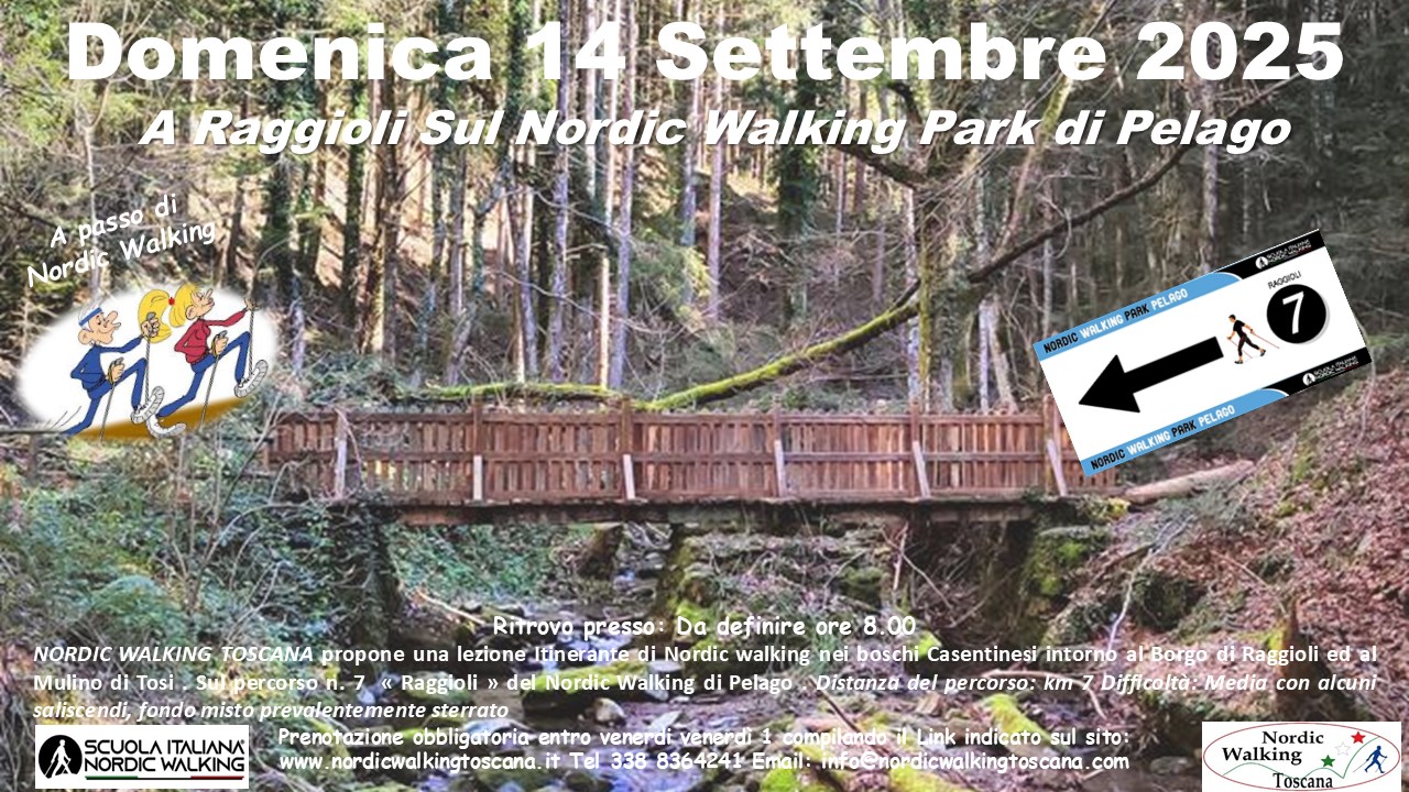 NORDIC WALKING TOSCANA propone Domenica 14 Settembre 2025 una lezione Itinerante sul sul Nordic Walking Park di Pelago percorso n. 7 ” Raggioli “. Nei boschi Casentinesi, alle pendici di Vallombrosa, all’antico Borgo di Raggioli, al Mulino di Tosi ed alla suggestiva Pieve di Magnale a passo di Nordic walking. Promozionalmente aperto anche ai camminatori a passo libero. Distanza del percorso: km 7 Difficoltà: Media con alcuni saliscendi fondo misto prevalentemente Sterrato. Prenotazione obbligatoria entro Venerdì 12 compilando il modulo sottostante. Indicando nel campo Evento scelto ” Raggioli ”