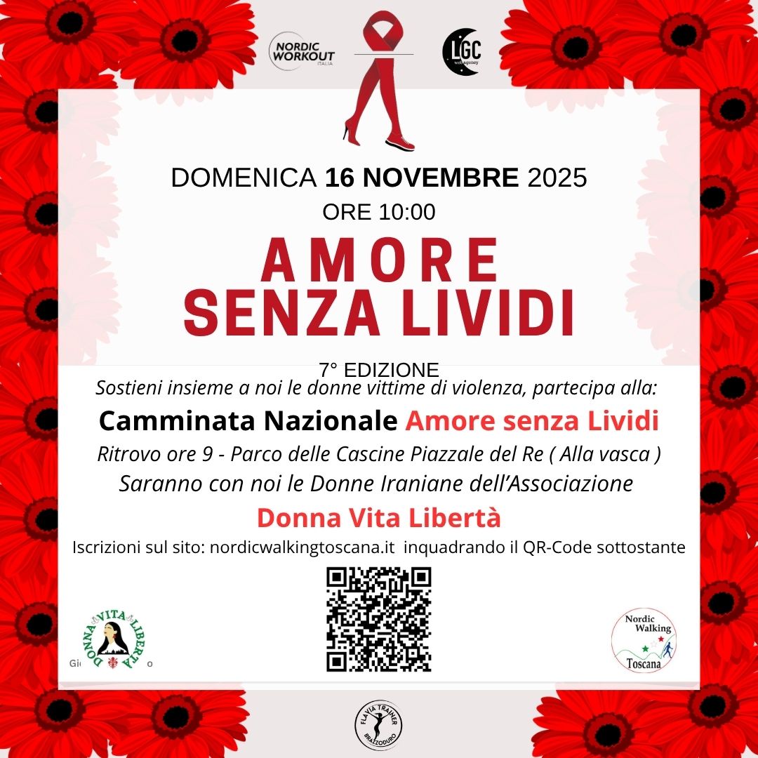 Nordic Walking Toscana Domenica 16 Novembre 2025 propone: La Camminata Nazionale Amore senza Lividi a sostegno delle donne vittime di qualsiasi forma di violenza. In occasione della camminata di solidarietà contro la violenza sulle Donne avremo come testimonial alcune Donne Iraniane dell’associazione ” Donna Vita Libertà “Per testimoniarci la loro condizione e l’incasso sarà a loro devoluto. Vi sarà donato un Gadget da indossare. Lungo il percorso ci soffermeremo ad una Panchina Rossa in ricordo di una ragazza uccisa.