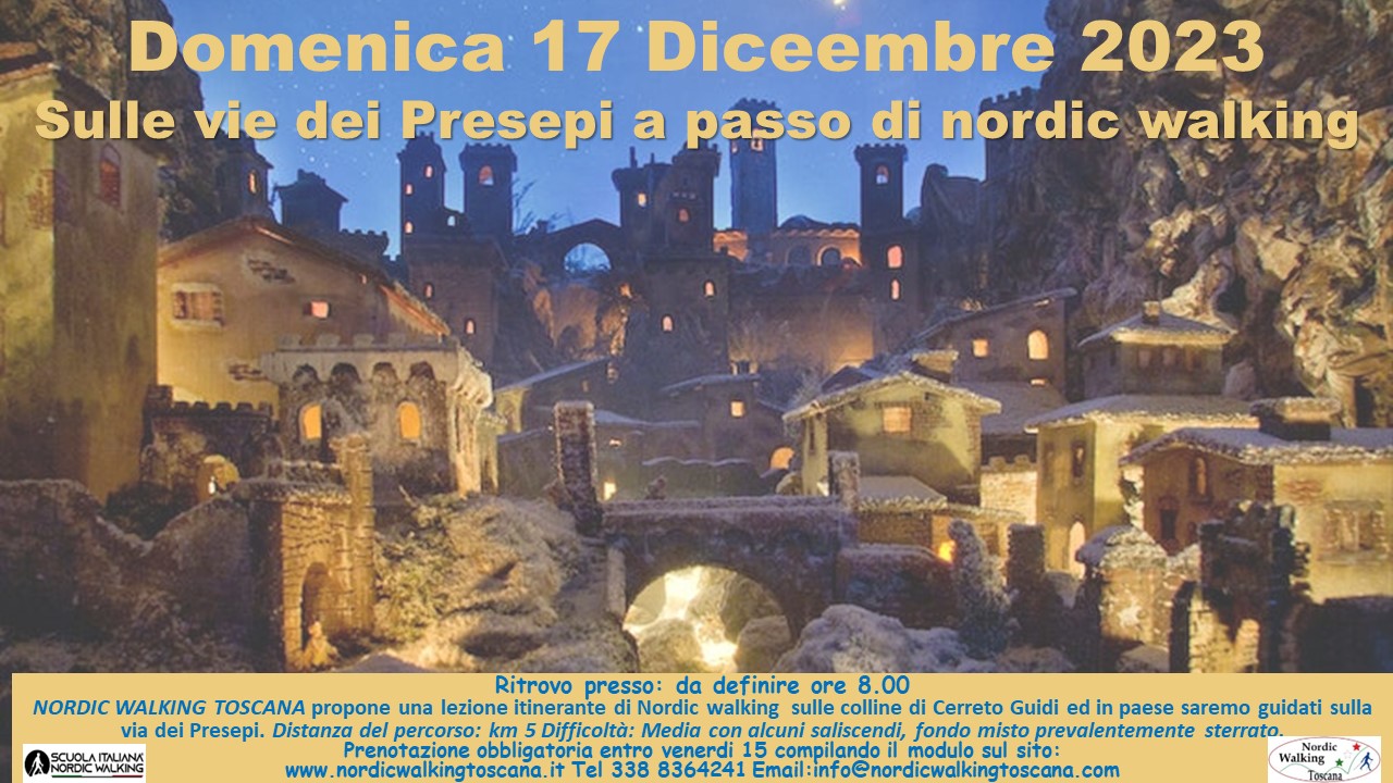 NORDIC WALKING TOSCANA propone Domenica 17 Dicembre 2023 una lezione Itinerante a passo di Nordic Walking sulle colline intorno a Cerreto Guidi, ed in Paese saremo guidati lungo la Via dei Presepi. In particolare, al Presepe all’uncinetto, unico nel suo genere. Distanza del percorso: km 5 Difficoltà: Media, fondo misto prevalentemente Sterrato. Prenotazione obbligatoria entro Venerdì 15 compilando il modulo sottostante, indicando nel campo Evento scelto: ” La Via dei Presepi ”