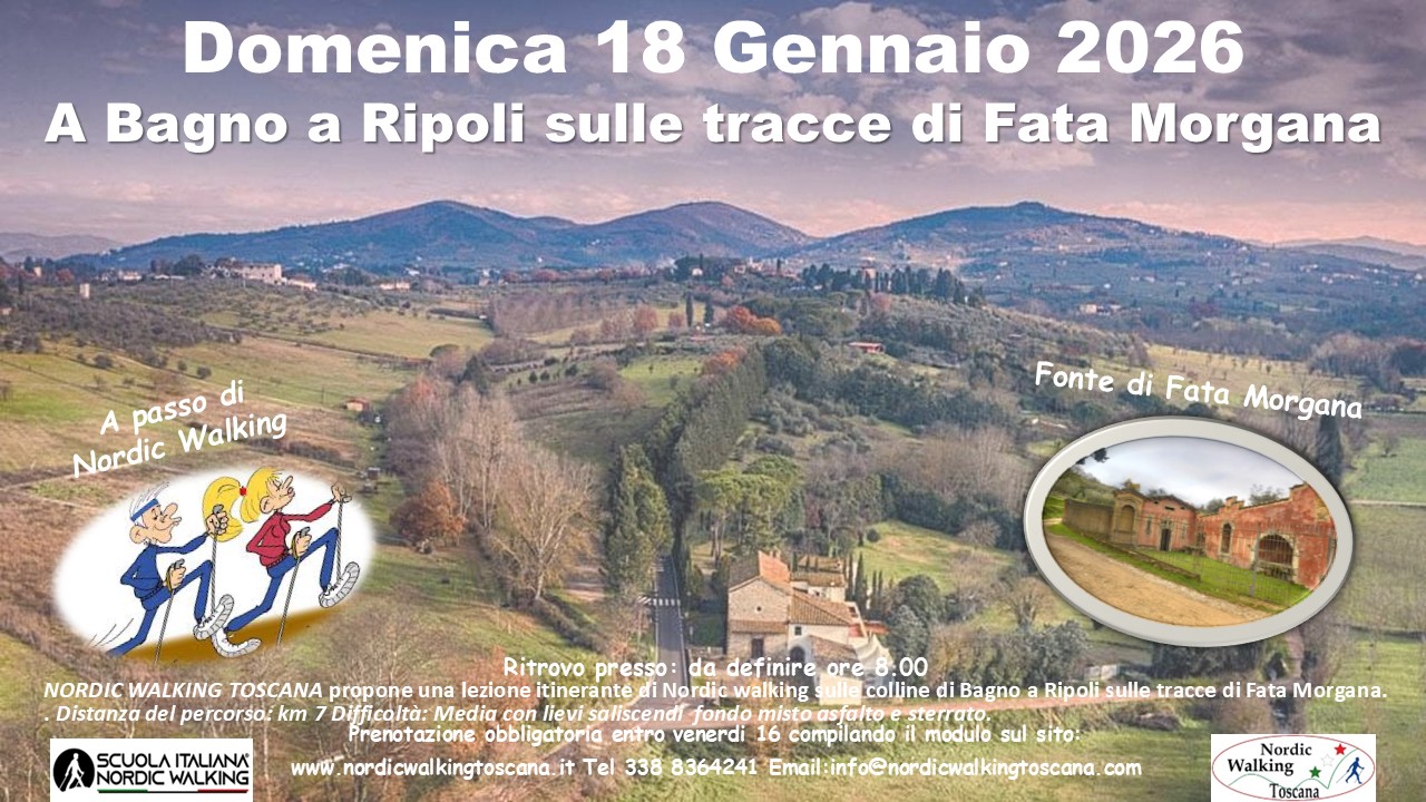 NORDIC WALKING TOSCANA propone Domenica 18 Gennaio 2026 una Lezione Itinerante sulle colline di Bagno a Ripoli sulle orme di Fata Morgana a passo di Nordic walking. Percorso 7 Km. Difficoltà: Media con alcuni saliscendi, fondo misto asfalto e sterrato. Prenotazione obbligatoria entro Venerdì 16 compilando il modulo sottostante. Indicando nel campo Evento scelto ” Fata Morgana ”