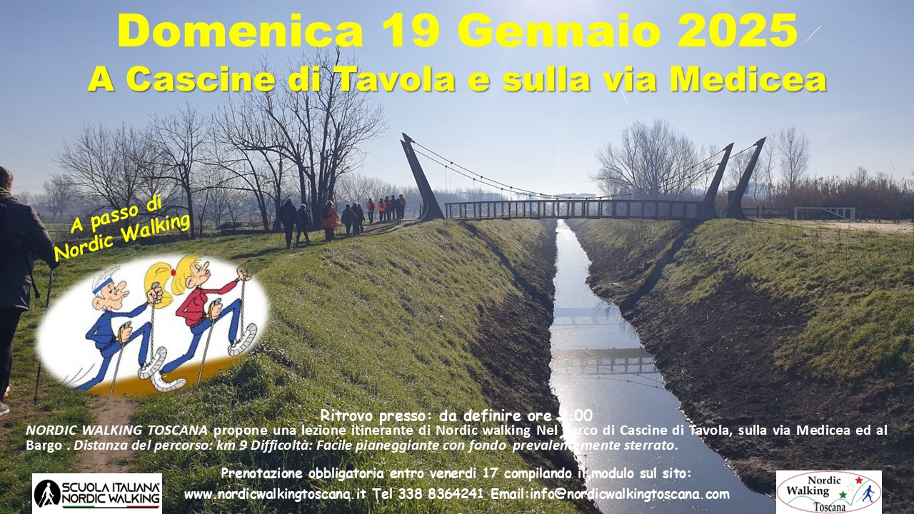 NORDIC WALKING TOSCANA propone Domenica 19 Gennaio 2025 una Lezione Itinerante al parco di Cascine di Tavola, sul Nordic Walking Park, sulla via Medicea ed al Bargo a passo di Nordic walking. Distanza del percorso: km 9. Difficoltà: Facile con pochi saliscendi, fondo misto prevalentemente sterrato. Prenotazione obbligatoria entro Venerdì 17 compilando il modulo sottostante. Indicando nel campo Evento scelto ” Cascine di Tavola ”