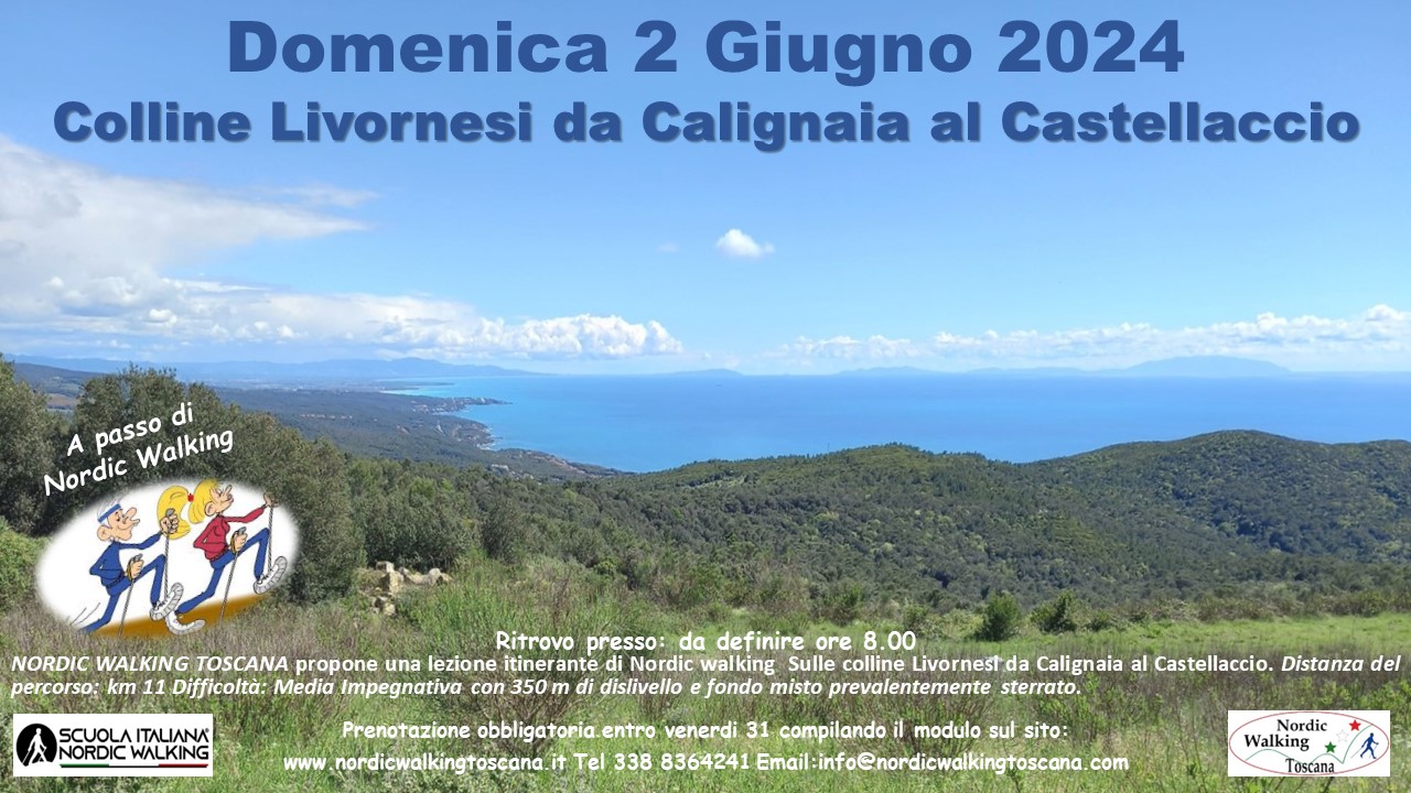 NORDIC WALKING TOSCANA propone Domenica 2 Giugno una lezione Itinerante sulle colline di Livornesi, Calignaia e Castellaccio. Distanza del percorso: km 11 Difficoltà: Media / Impegnativa con salite. dislivello 350 m. fondo misto prevalentemente sterrato. Prenotazione obbligatoria entro Venerdì 31 compilando il modulo sottostante in dicando nel campo Titolo evento ” Calignaia”.