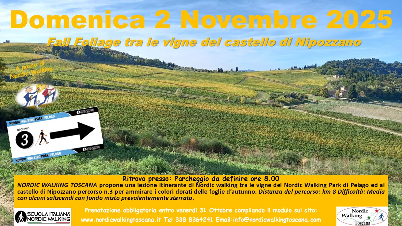 NORDIC WALKING TOSCANA propone Domenica 2 Novembre 2025 una lezione Itinerante sul sul Nordic Walking Park di Pelago percorso n. 3 ” Nipozzano. Nelle Vigne del Chianti per ammirare il colore delle foglie autunnali a passo di Nordic Walking. Come tutti gli eventi del Parco, è promozionalmente aperto anche ai camminatori a passo libero. Un’occasione per conoscere il nostro sport e la nostra associazione. Distanza del percorso: km 8 Difficoltà: Media con alcuni saliscendi fondo misto prevalentemente Sterrato. Prenotazione obbligatoria entro Venerdì 31 Ottobre compilando il modulo sottostante indicando nel campo evento scelto ” Nipozzano ”