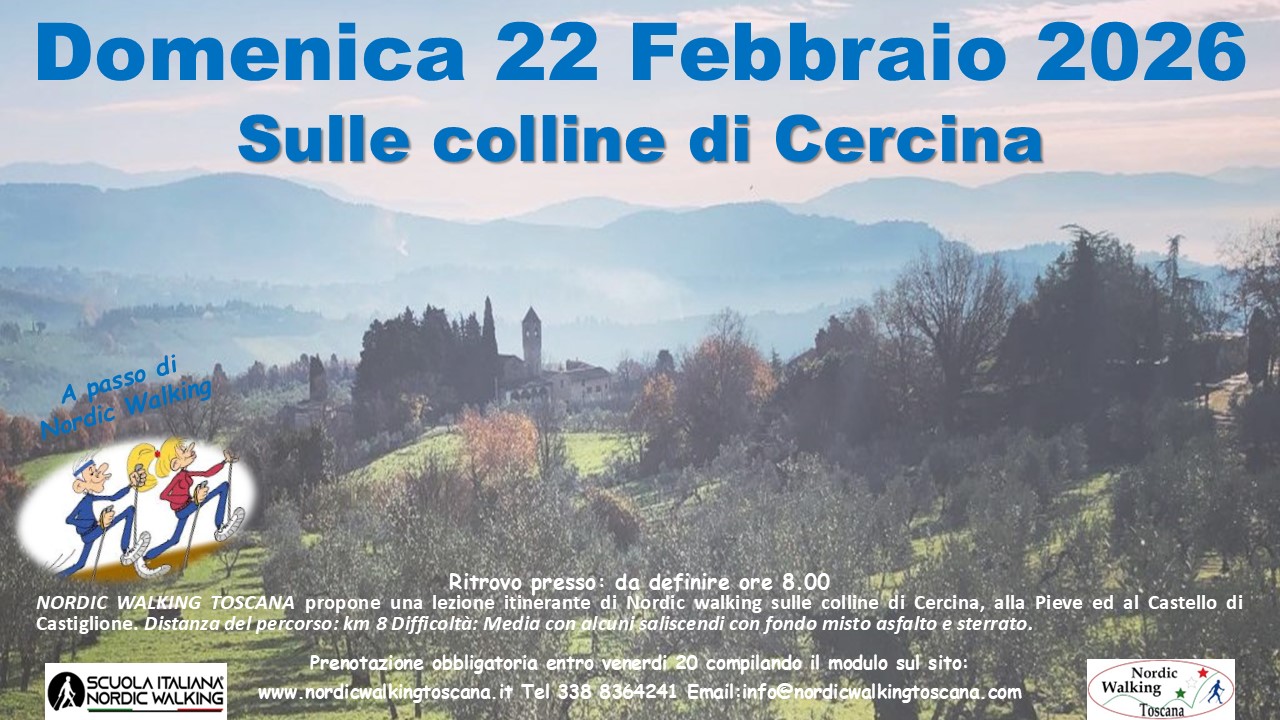 NORDIC WALKING TOSCANA propone Domenica 22 Febbraio 2026 una Lezione Itinerante sulle colline di Cercina, alla Pieve ed al Castello di Castiglione a passo di Nordic walking. Percorso 8 Km.  Difficoltà: Medio con alcuni saliscendi, fondo misto asfalto e sterrato. Prenotazione obbligatoria entro Venerdì 20 Febbraio compilando il modulo sottostante. Indicando nel campo Evento scelto ” Cercina ”