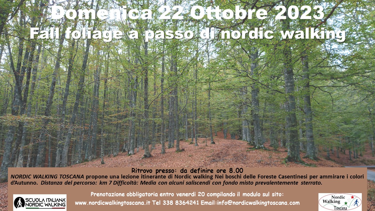 NORDIC WALKING TOSCANA propone Domenica 22 Ottobre 2023 una lezione Itinerante a passo di Nordic Walking nelle Foreste Casentinesi per ammirare i colori del fall Foliage d’Autunno. Distanza del percorso: km 7 Difficoltà: Medio con alcuni saliscendi fondo misto prevalentemente Sterrato. Prenotazione obbligatoria entro Venerdì 20 compilando il modulo sottostante.