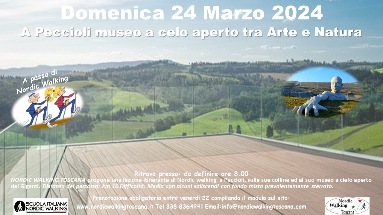 NORDIC WALKING TOSCANA propone Domenica 24 Marzo 2024 una lezione Itinerante tra Arte e Natura a Peccioli sulle colline ed al Museo a cielo aperto con i suoi giganti a passo di Nordic Walking. Percorso 10 km. Difficoltà: Media, fondo misto, prevalentemente Sterrato. Prenotazione obbligatoria entro Venerdì 22 compilando il modulo sottostante, indicando nel campo Evento scelto: ” Peccioli ”