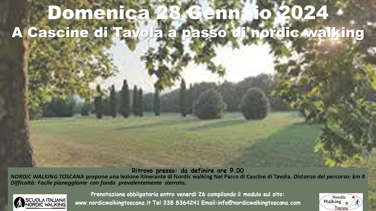 NORDIC WALKING TOSCANA propone Domenica 28 Gennaio 2024 una lezione Itinerante a passo di Nordic Walking al Parco di Cascine di Tavola . Percorso  8 km. Difficoltà: Facile prevalentemente pianeggiante, fondo misto prevalentemente Sterrato. Prenotazione obbligatoria entro Venerdì 26 compilando il modulo sottostante, indicando nel campo Evento scelto: ” Cascine di Tavola ”