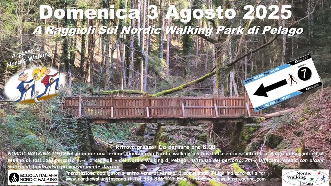 rNORDIC WALKING TOSCANA propone Domenica 3 Agosto 2025 una lezione Itinerante sul sul Nordic Walking Park di Pelago percorso n. 7 ” Raggioli “. Nei boschi Casentinesi, all’antico Borgo di Raggioli ed al Mulino di Tosi a passo di Nordic walking. Promozionalmente aperto anche ai camminatori a passo libero. Distanza del percorso: km 7 Difficoltà: Media con alcuni saliscendi fondo misto prevalentemente Sterrato. Prenotazione obbligatoria entro Venerdì 1 compilando il modulo sottostante. Indicando nel campo Evento scelto ” Raggioli ”