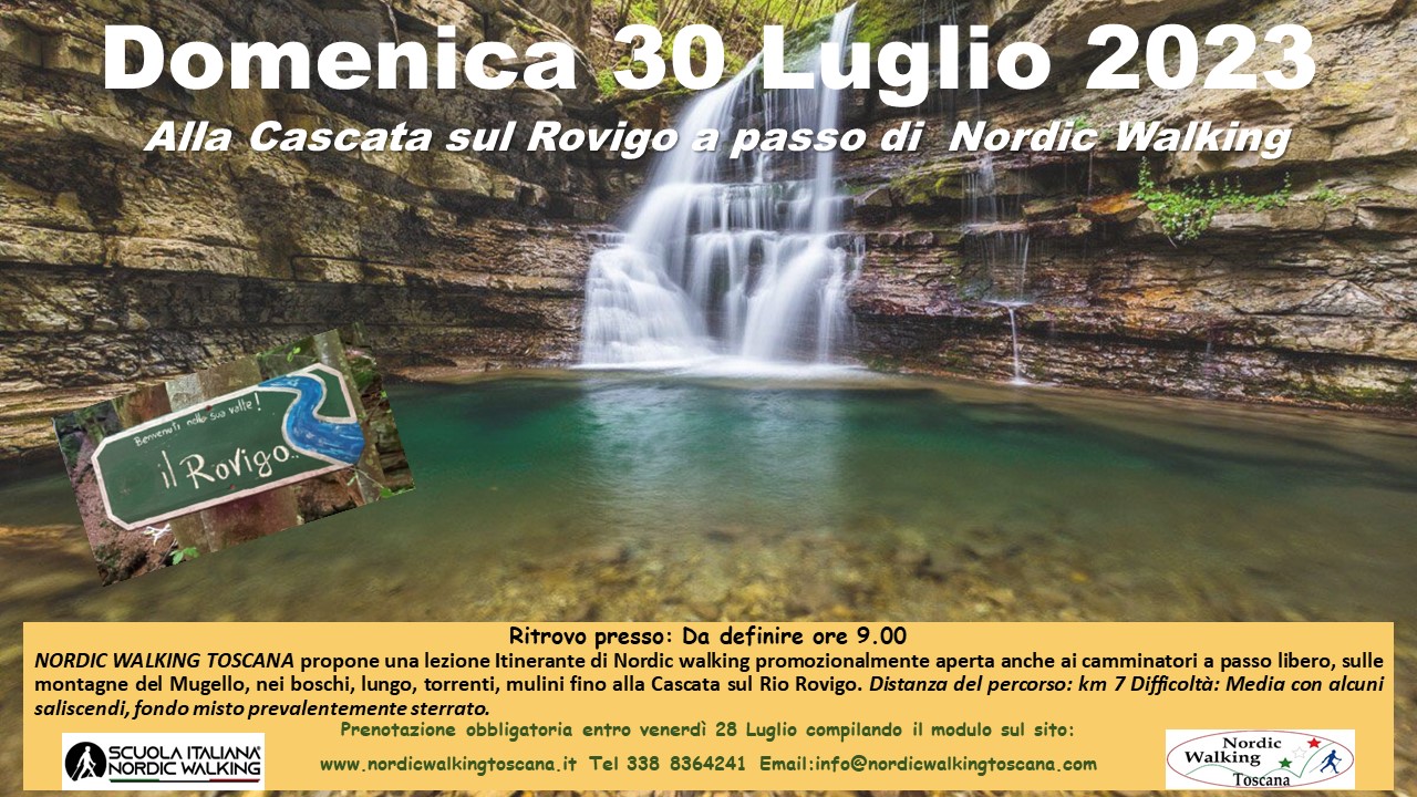 NORDIC WALKING TOSCANA propone Domenica 30 Luglio 2023 una lezione Itinerante nel Mugello. Nei boschi, ai Mulini e lungo le sponde del Rio Rovigo fino alla omonima Cascata a passo di Nordic walking e promozionalmente aperta anche ai camminatori a passo libero. Distanza del percorso: km 7 Difficoltà: Media con alcuni saliscendi fondo misto prevalentemente Sterrato. Prenotazione obbligatoria entro Venerdì 28 compilando il modulo sottostante.