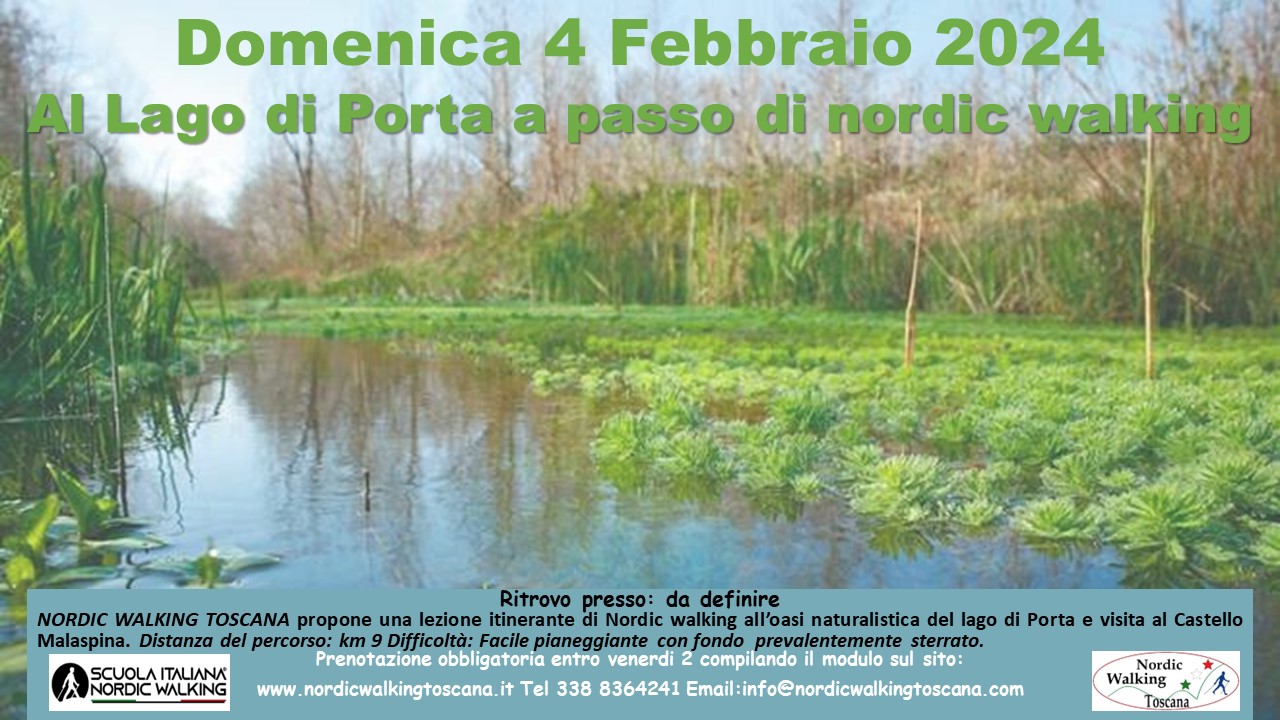 NORDIC WALKING TOSCANA propone Domenica 4 Febbraio 2024 una lezione Itinerante a l’Oasi naturalistica del Lago di Porta a passo di Nordic Walking e la visita al Castello Malaspina. Percorso 9 km. Difficoltà: Facile prevalentemente pianeggiante, fondo prevalentemente Sterrato. Prenotazione obbligatoria entro Venerdì 2 compilando il modulo sottostante, indicando nel campo Evento scelto: ” Lago di Porta ”