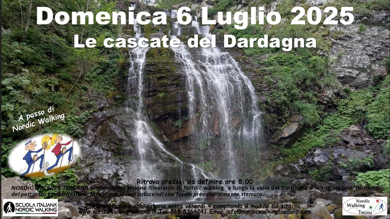 NORDIC WALKING TOSCANA propone Domenica 6 Luglio 2025 una lezione Itinerante lungo il torrente Dardagna, alle sue cascate, al Cavone ed a Madonna dell’Acero a passo di Nordic Walking. Percorso 8 km. Difficoltà: Media, con numerosi saliscendi, fondo prevalentemente Sterrato. Prenotazione obbligatoria entro Venerdì 4 compilando il modulo sottostante, indicando nel campo Evento scelto: ” Cascate del Dardagna ”