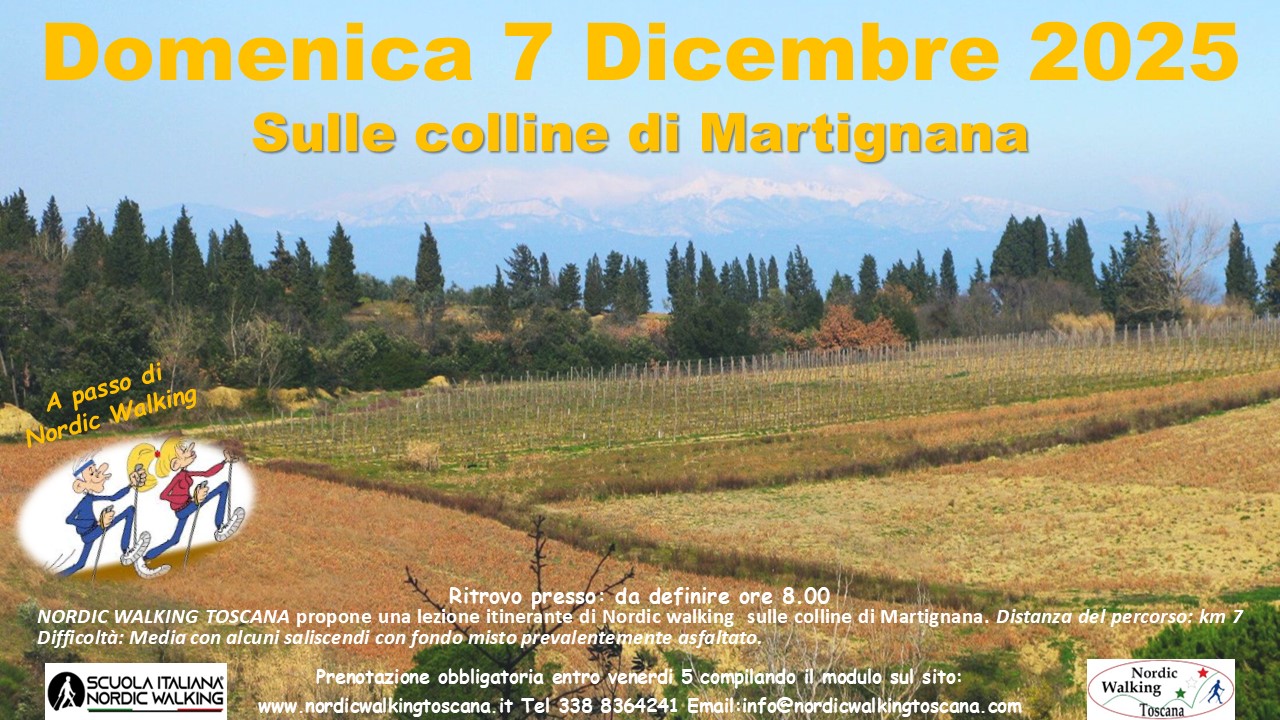 NORDIC WALKING TOSCANA propone Domenica 7 Dicembre 2025 una Lezione Itinerante sulle Colline di Martignana. a passo di Nordic walking. Distanza del percorso: km 7 Difficoltà: Media con pochi saliscendi, fondo misto prevalentemente asfalto. Prenotazione obbligatoria entro Venerdì 5 compilando il modulo sottostante. Indicando nel campo Evento scelto ” Martignana ”