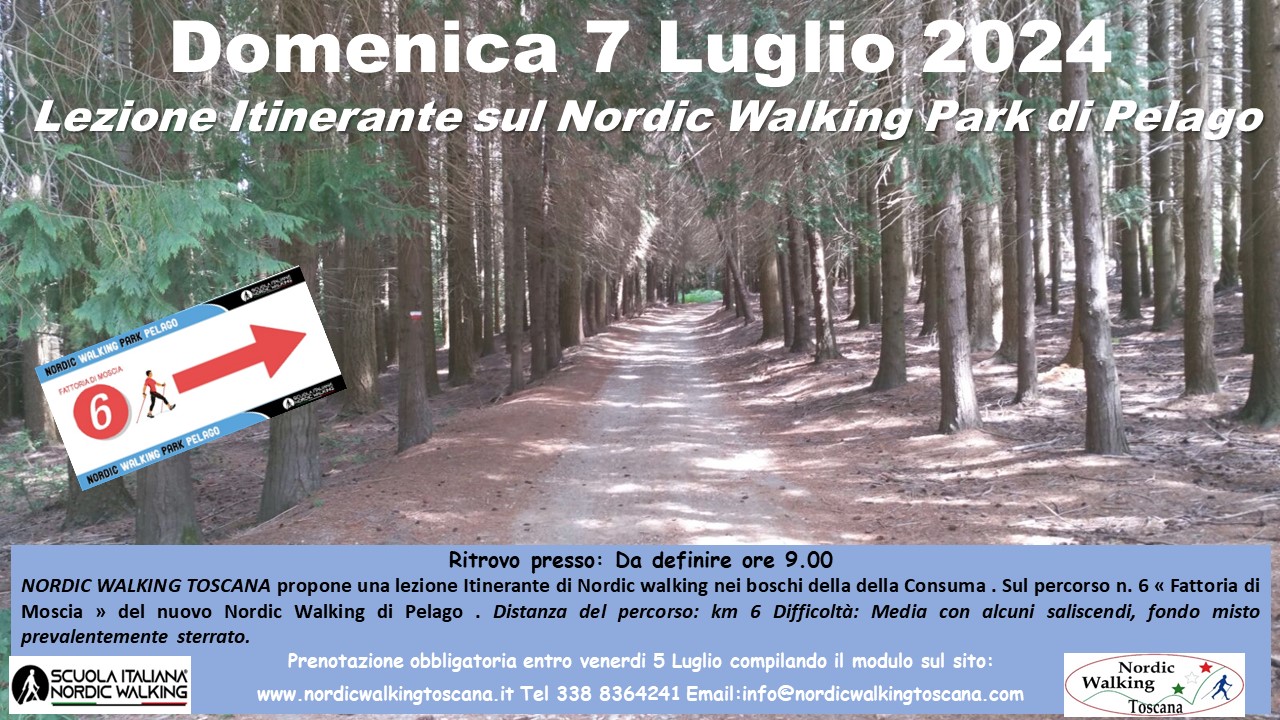 NORDIC WALKING TOSCANA propone Domenica Luglio 2024 una lezione Itinerante sul sul Nordic Walking Park di Pelago percorso n. 6 ” Fattoria di Moscia. Nei boschi della Consuma  a passo di Nordic walking. Distanza del percorso: km 6  Difficoltà: Media con alcuni saliscendi fondo misto prevalentemente Sterrato. Prenotazione obbligatoria entro Venerdì 5 compilando il modulo sottostante indicando nel campo evento scelto ” Fattoria di Moscia ”