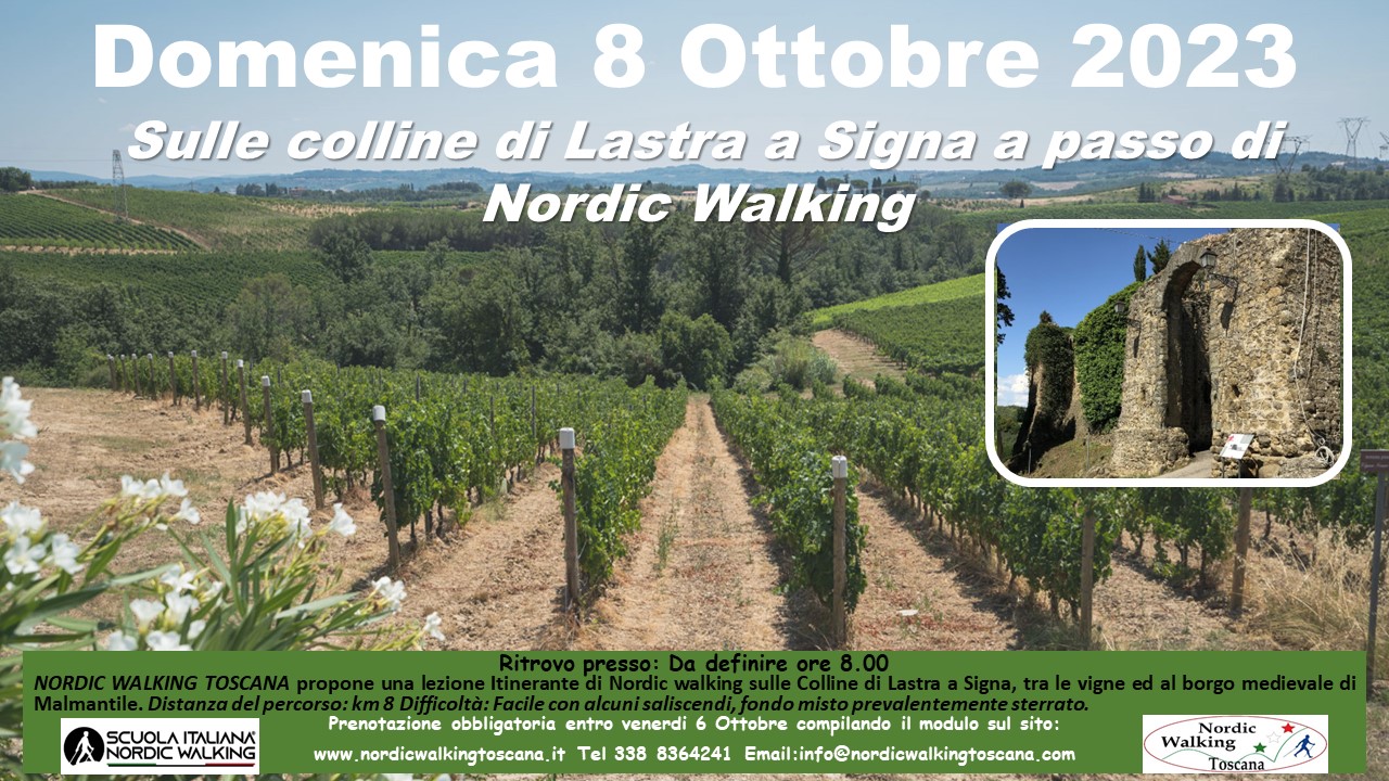 NORDIC WALKING TOSCANA propone Domenica 8 Ottobre 2023 una lezione Itinerante a passo di Nordic Walking sulle Colline, lungo le Vigne ed al borgo medievale di Malmantile. Distanza del percorso: km 8 Difficoltà: Facile con alcuni saliscendi fondo misto prevalentemente Sterrato. Prenotazione obbligatoria entro Venerdì 6 compilando il modulo sottostante.