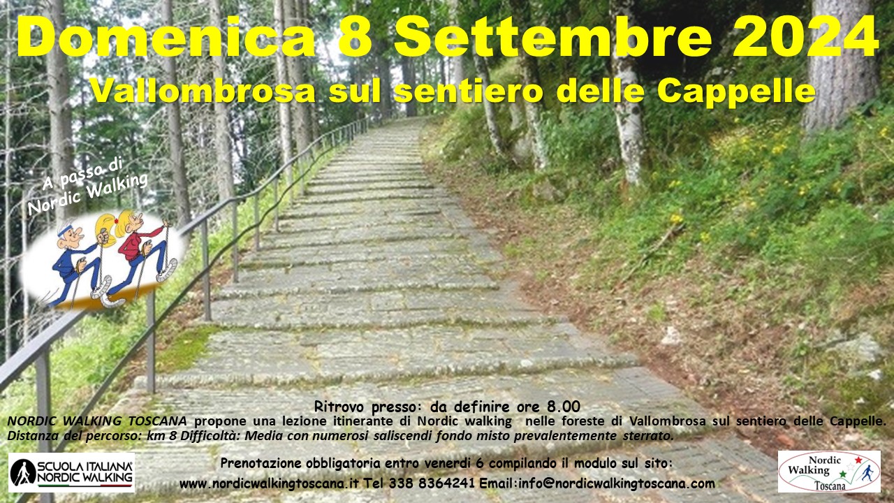 NORDIC WALKING TOSCANA propone Domenica 8 Settembre 2024 una lezione Itinerante nei Boschi di Vallombrosa sul sentiero delle Cappelle a passo di Nordic walking. Distanza del percorso: km 8 Difficoltà: Medio con molti saliscendi fondo misto prevalentemente Sterrato. Prenotazione obbligatoria entro Venerdì 6 compilando il modulo sottostante. Indicando nel campo Evento scelto ” Sentiero delle Cappelle ”