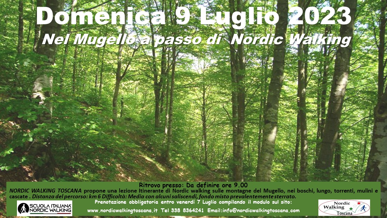 NORDIC WALKING TOSCANA propone Domenica 9 Luglio 2023 una lezione Itinerante nel Mugello. Nei boschi tra acque, mulini e cascate a passo di Nordic walking. Distanza del percorso: km 6  Difficoltà: Media con alcuni saliscendi fondo misto prevalentemente Sterrato. Prenotazione obbligatoria entro Venerdì 7 compilando il modulo sottostante.