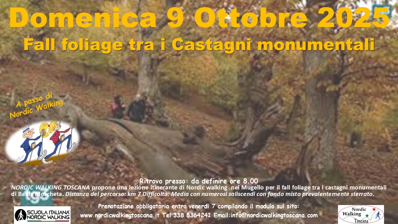 NORDIC WALKING TOSCANA propone Domenica 9 Novembre 2025 una lezione Itinerante a passo di Nordic Walking nel Mugello per ammirare lo spettacolare fenomeno dei colori autunnali delle foglie, tra i Castagni monumentali a Badia Moscheta. Distanza del percorso: km 7 Difficoltà: Media con numerosi saliscendi, fondo Sterrato. Prenotazione obbligatoria entro Venerdì 7 compilando il modulo sottostante indicando nel campo titolo evento: ” Castagni Monumentali ”