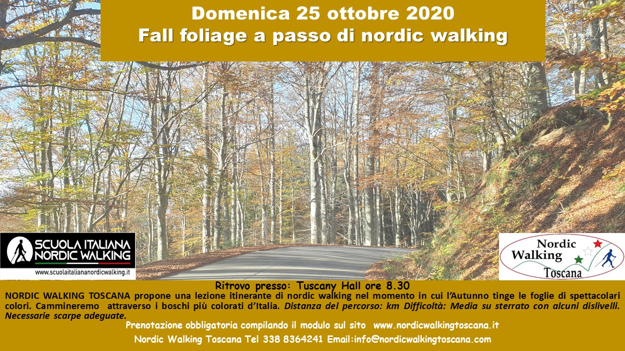 Lezione itinerante di nordic walking su un percorso che ci permetterà di ammirare al meglio il colore delle foglie di autunno. Andremo sul crinale del Pratomagno ad ammirare uno dei più bei foliage d’Italia. Il percorso é sterrato e non presenta particolari difficoltà. E’ necessario abbigliamento adeguato in quanto la lezione si svolgerà ad una altitudine di circa 1200 m. Durata prevista 3 ore. km 8