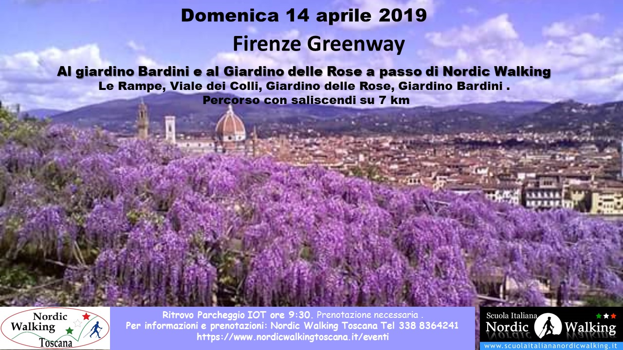 La nostra tradizionale lezione itinerante lungo il viale dei colli e i principali giardini di Firenze ci porta questa volta attraverso il giardino delle Rose e il giardino Bardini per ammirare la spettacolare fioritura del glicine. Ritrovo presso il parcheggio dello IOT (Ospedale Pietro Palagi) Viale Michelangelo ore 9:30. La lezione é riservata a chi ha fatto almeno un cosro base di nordic walking.