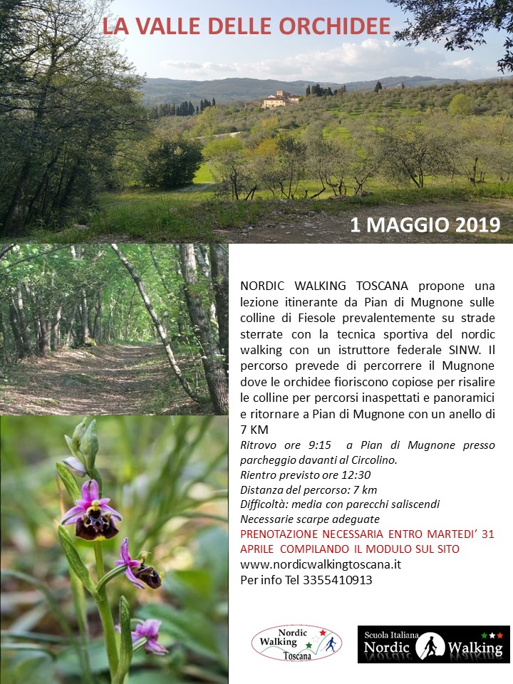 NORDIC WALKING TOSCANA propone una lezione itinerante da Pian di Mugnone sulle colline di Fiesole prevalentemente su strade sterrate con la tecnica sportiva del nordic walking con istruttori federali SINW. Il percorso prevede di percorrere il Mugnone dove le orchidee fioriscono copiose per risalire le colline per percorsi inaspettati e panoramici e ritornare a Pian di Mugnone con un anello di 7 KM Ritrovo ore 9:15 a Pian di Mugnone presso parcheggio davanti al Circolino. Rientro previsto ore 12:30 Difficoltà: media con parecchi saliscendi