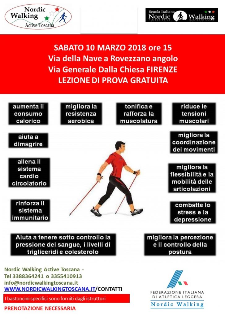Vuoi provare il nordic walking? Sabato 10 marzo si terrà una lezione di prova gratuita con introduzione alla teoria che sta alla base di questo sport seguita da una prova pratica di nordic walking sul Lungarno. Prenotazione necessario al modulo sottostante. I bastoncini saranno forniti dagli istruttori