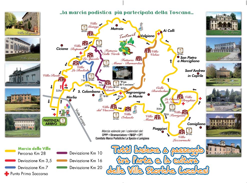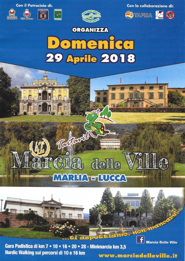 Quest’anno il nordic walking entra dalla porta principale nella Marcia delle Ville sui percorsi di 10 e 16 km, particolarmente adatti al nostro sport. Gli istruttori di Nordic Walking Active Toscana aspetteranno i praticanti il nordic walking alle ore 7:15 in Piazza del Mercato a Marlia per proporre esercizi di riscaldamento e partire alle 7:30 lungo i due bellissimi percorsi. Il percorso di 10 km é prevalentemente sterrato e presenta una sola salita moderata mentre il percorso di 16 km presenta una lunga ma graduale salita prevalentemente su asfalto fino al paese di Matraia da dove sarà possibile ammirare un panorama mozzafiato sulla piana della Lucchesia. Imperdibile anche il passaggio presso la chiesa di San Quirico in Petroio e la vista dal giardino di Villa La Specola.