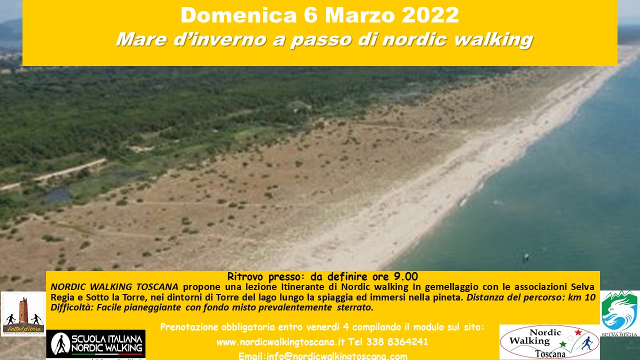 Domenica 6 marzo lezione itinerante in gemellaggio con le associazioni Selva regia e Sotto la Torre nei dintorni di Torre del Lago lungo la spiaggia. Percorso facile di 10 km pianeggiante.
