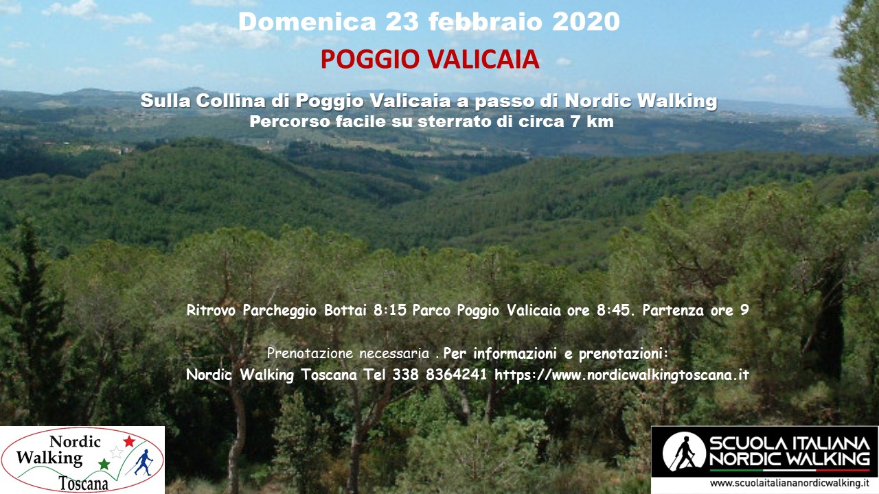 Domenica 23 febbraio lezione itinerante di nordic walking sulle strade sterrate attorno a Poggio Valicaia . Percorso facile di circa 7 km. Ritrovo ore 8:15 al Parcheggio Bottai Eurolines. Ore 8:45 al Parcheggio del Parco di Poggio Valicaia. partenza ore 9