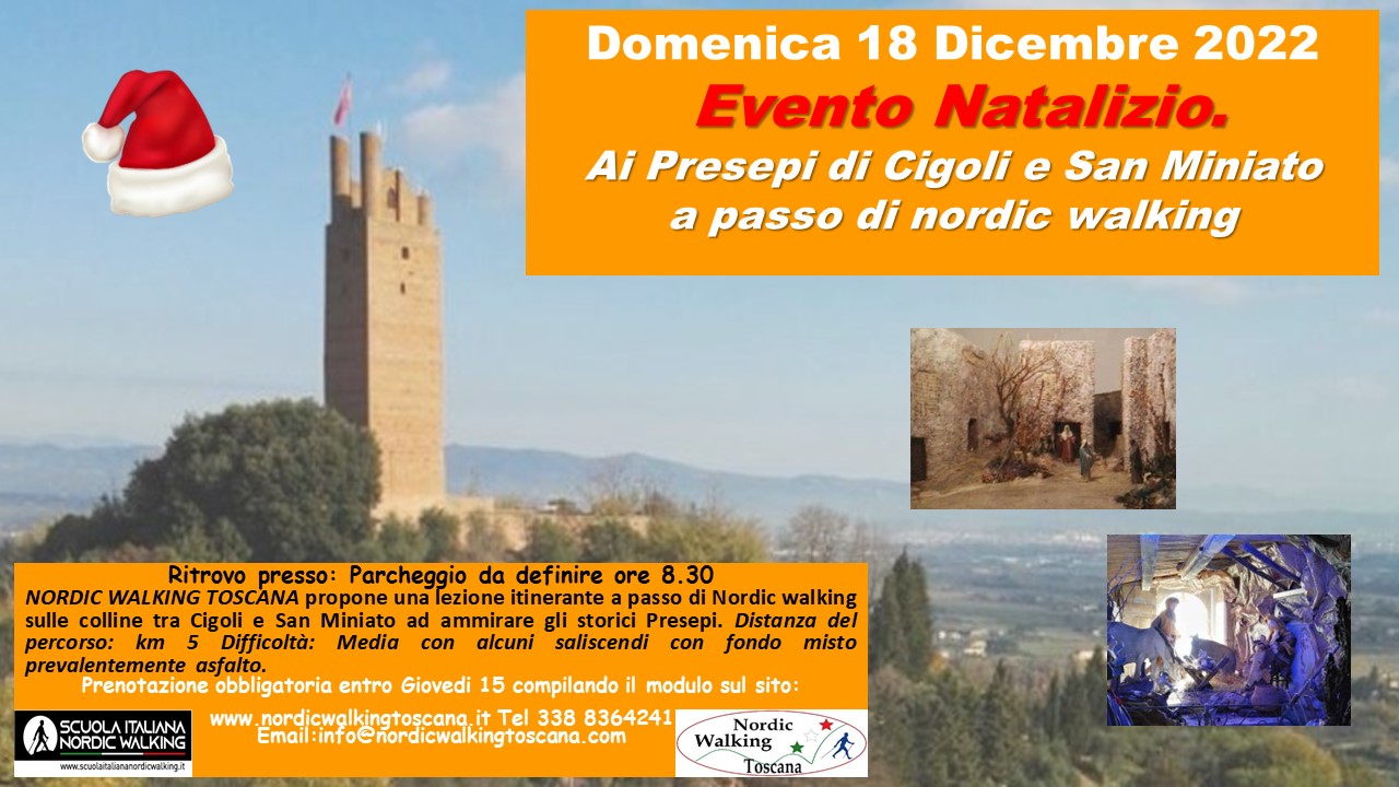 Anche quest’anno torniamo a San Miniato e Cigoli a passo di nordic walking per la consueta uscita natalizia insieme agli amici di Sotto La Torre. Iscrizioni aperte entro venerdì 16 dicembre compilando il modulo sottostante indicando San Miniato 18 dicembre, Percorso prevalentemente su asfalto