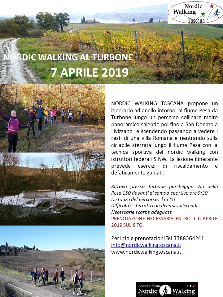 Itinerario ad anello intorno  al fiume Pesa da Turbone lungo un percorso collinare molto panoramico salendo poi fino a San Donato a Livizzano e scendendo passando a vedere i resti di una villa Romana e rientrando sulla ciclabile sterrata lungo il fiume Pesa con la tecnica sportiva del nordic walking con  istruttori federali SINW. La lezione itinerante prevede esercizi di riscaldamento e defaticamento guidati.