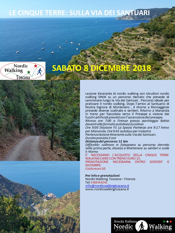 ??Lezione itinerante di nordic walking con istruttori nordic walking SINW su un percorso sterrato che prevede di camminare lungo la Via dei Santuari . Percorso ideale per praticare il nordic walking.in quanto prevede di camminare su una strada sterrata in falsopiano. Dopo l’arrivo al Santuario di Nostra Signora di Montenero, il ritorno a Riomaggiore prevede diverse scalinate e sentieri.