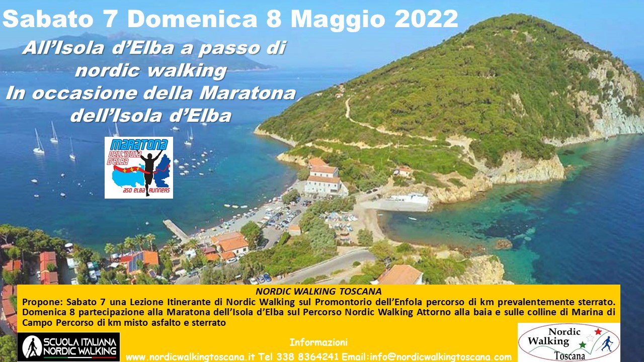 Sabato 7 e domenica 8 maggio andremo all’isola d’Elba in occasione della Maratona dell’Isola d’Elba. Sabato andremo a camminare all’Enfola mentre domenica faremo il percorso nordic walking della Maratona di 13 Km sulle colline attorno a Marina di Campo. Il percorso é visitabile al link al sito della Maratona: http://www.maratonadellisoladelba.it/info-gare/percorsi/nordic-walking/